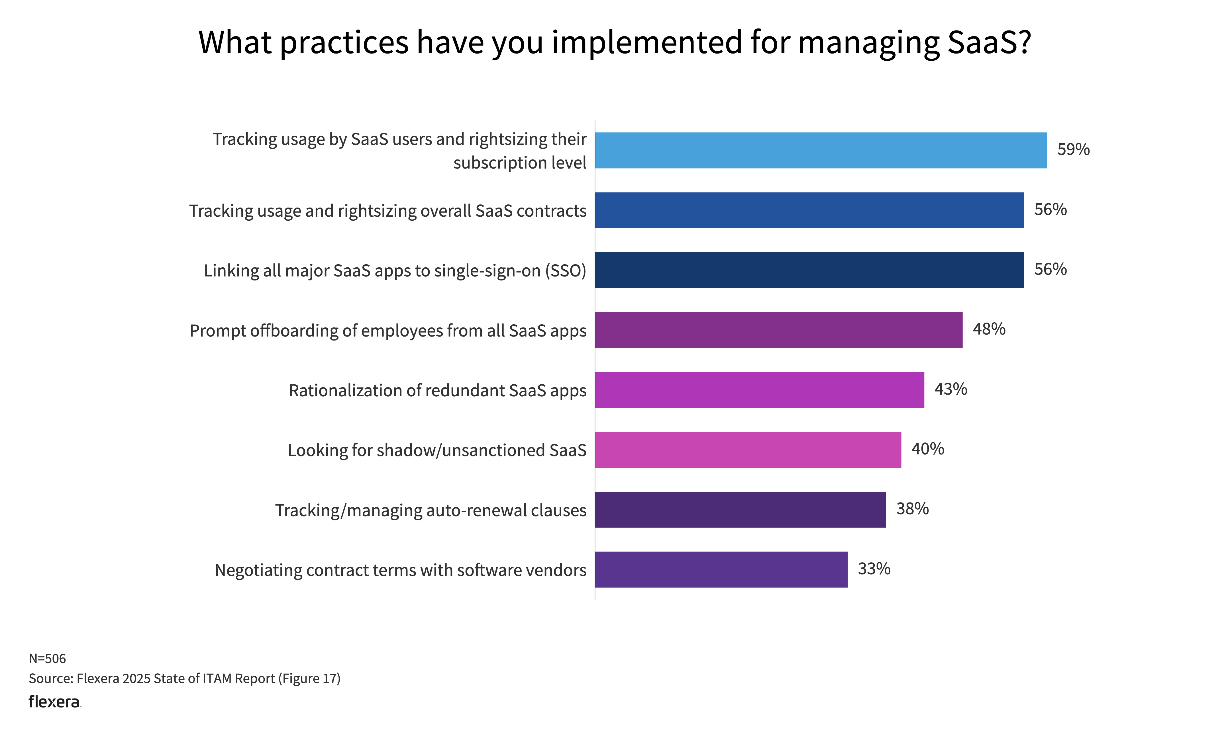 Improving the management of SaaS products is a top priority for SAM professionals. When implementing SaaS management practices, there’s a 7 percentage point increase in tracking SaaS usage and an 8 percentage point increase over a two-year period for rightsizing SaaS contracts, demonstrating these initiatives are becoming more and more of a priority.