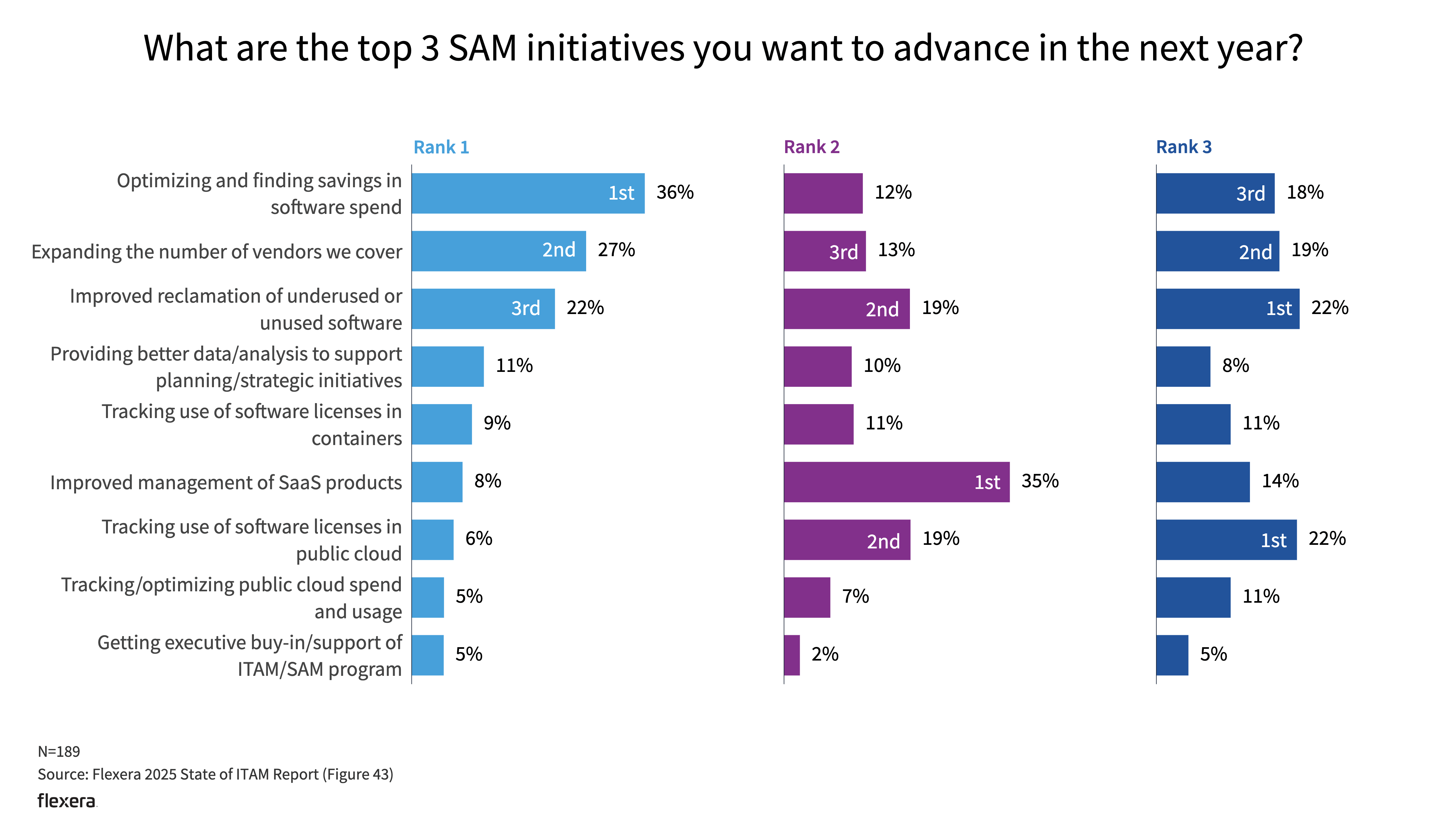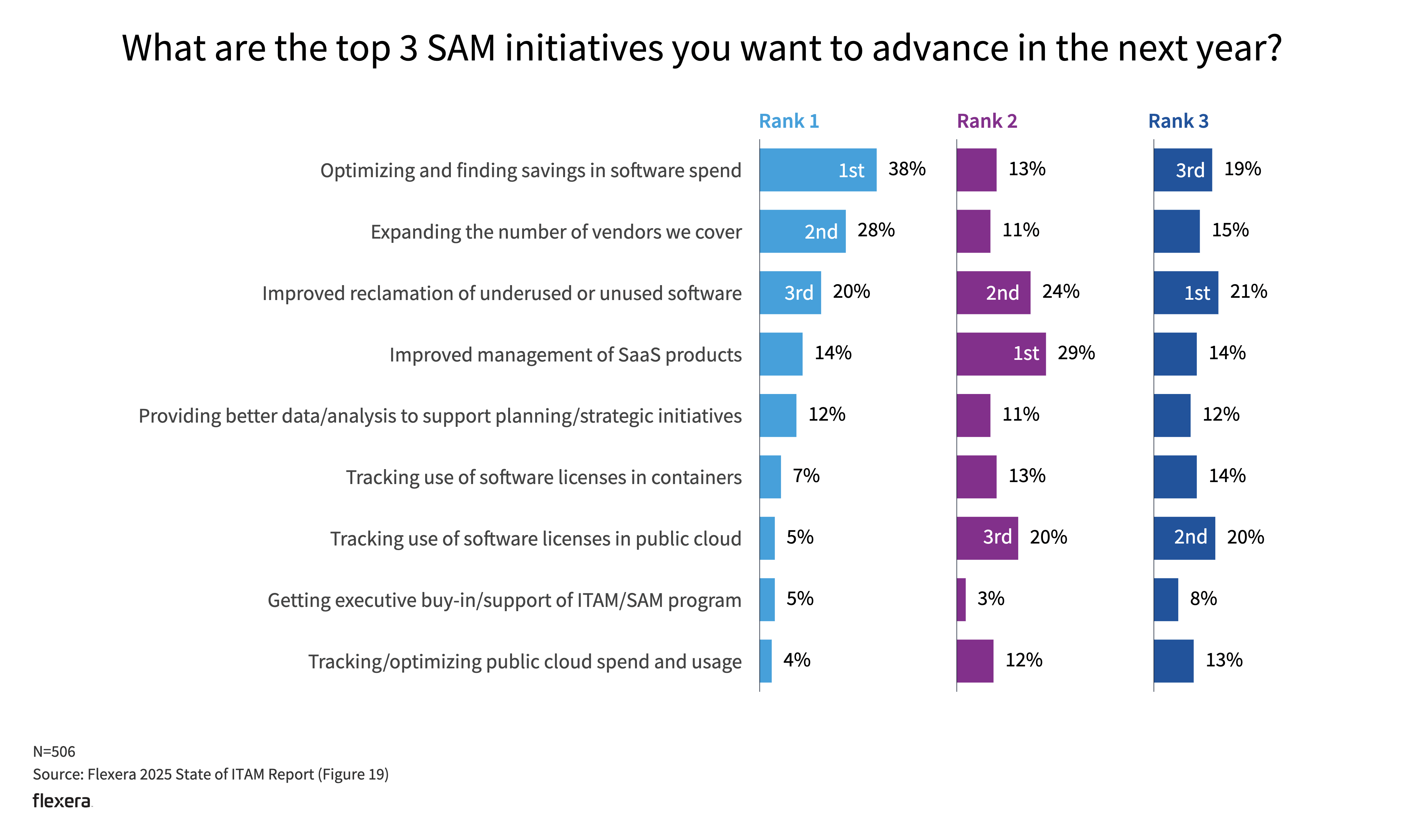 Interestingly, when asked about their top SAM initiatives, improving management of SaaS products has taken quite a fall from last year (down to 8% from 17% year over year), and it’s quite different from the North American response (19%). Unsurprisingly, optimizing and finding savings in software spend (36%) and expanding the number of vendors covered (27%) are still the top initiatives—but improved reclamation of underused and unused software (22%) had a noticeable 5 percentage point year-over-year increase. It will be interesting to see if this trend continues.