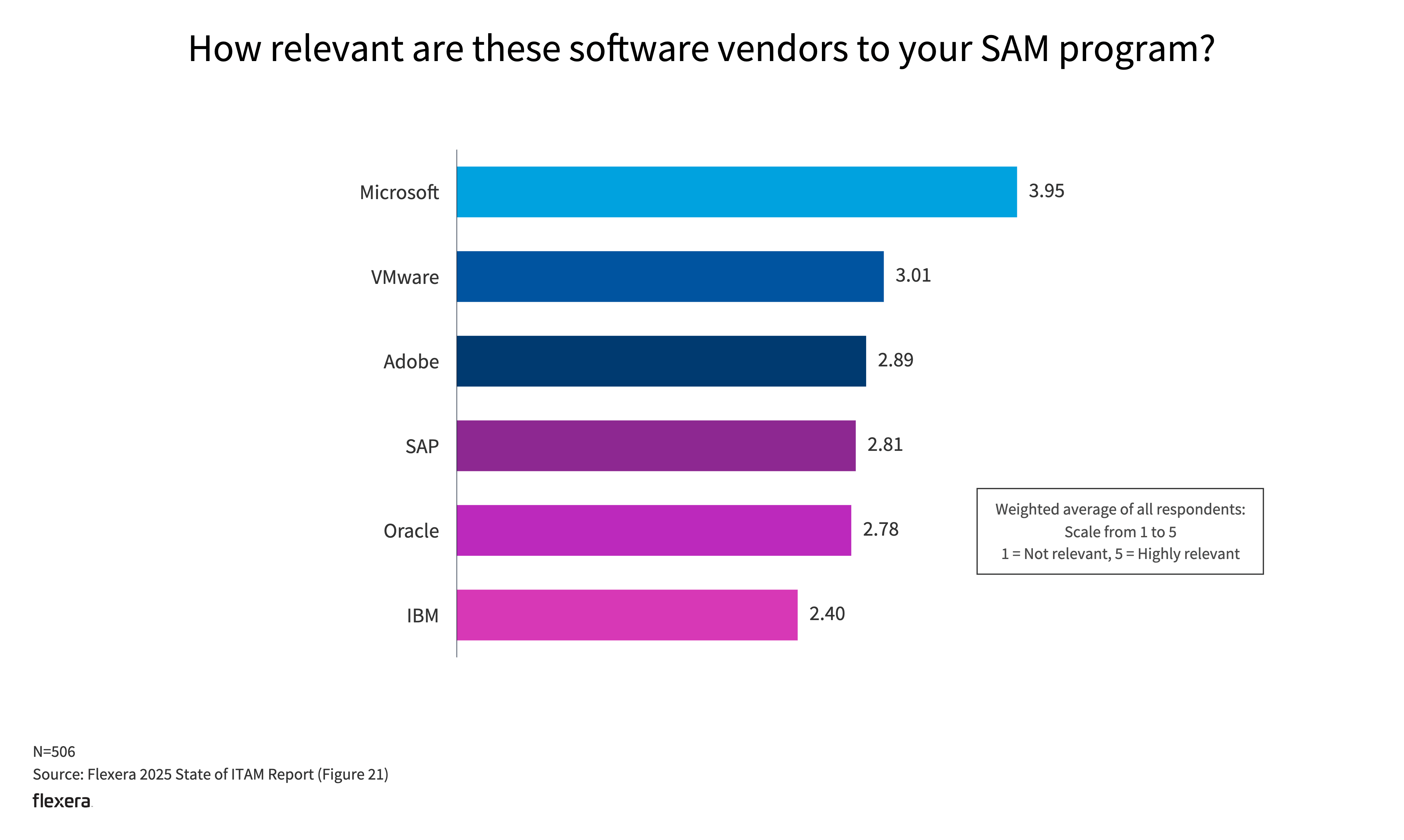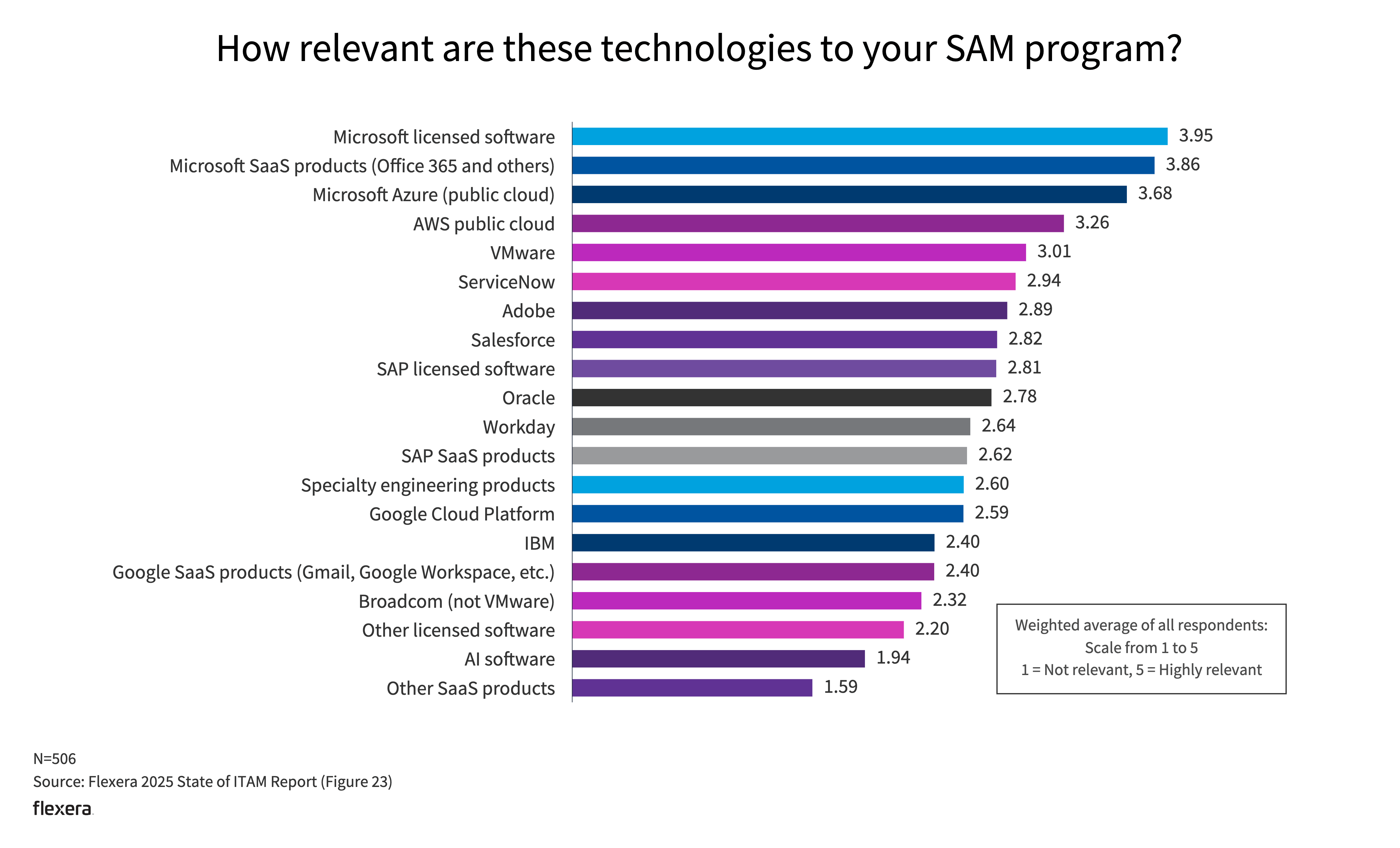 When asked how relevant certain software vendors are to respondents’ SAM program, there wasn’t much of a change year over year. The most relevant SaaS vendors were Microsoft, ServiceNow and Salesforce. But, when asked how relevant certain technologies are to respondents’ SAM program, Salesforce and Google Cloud Platform have grown in their order of importance.