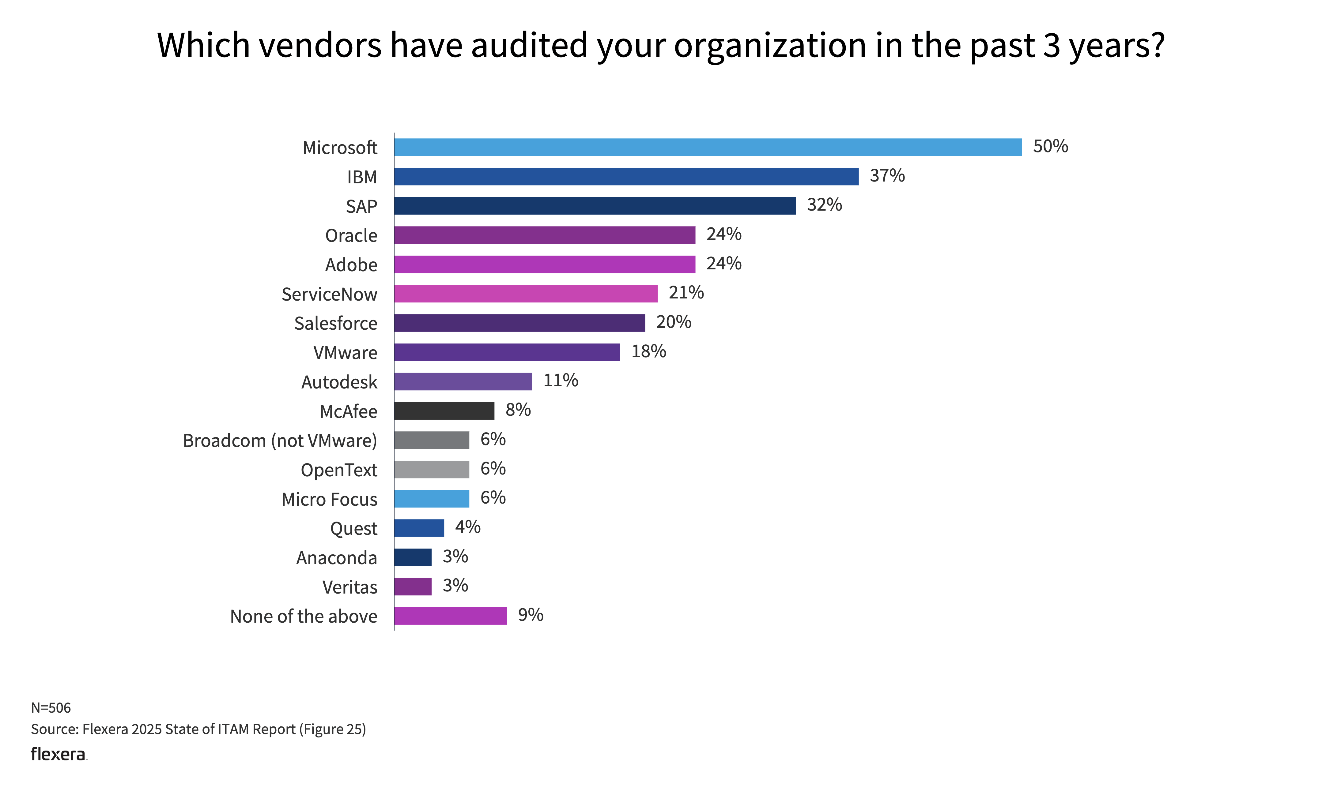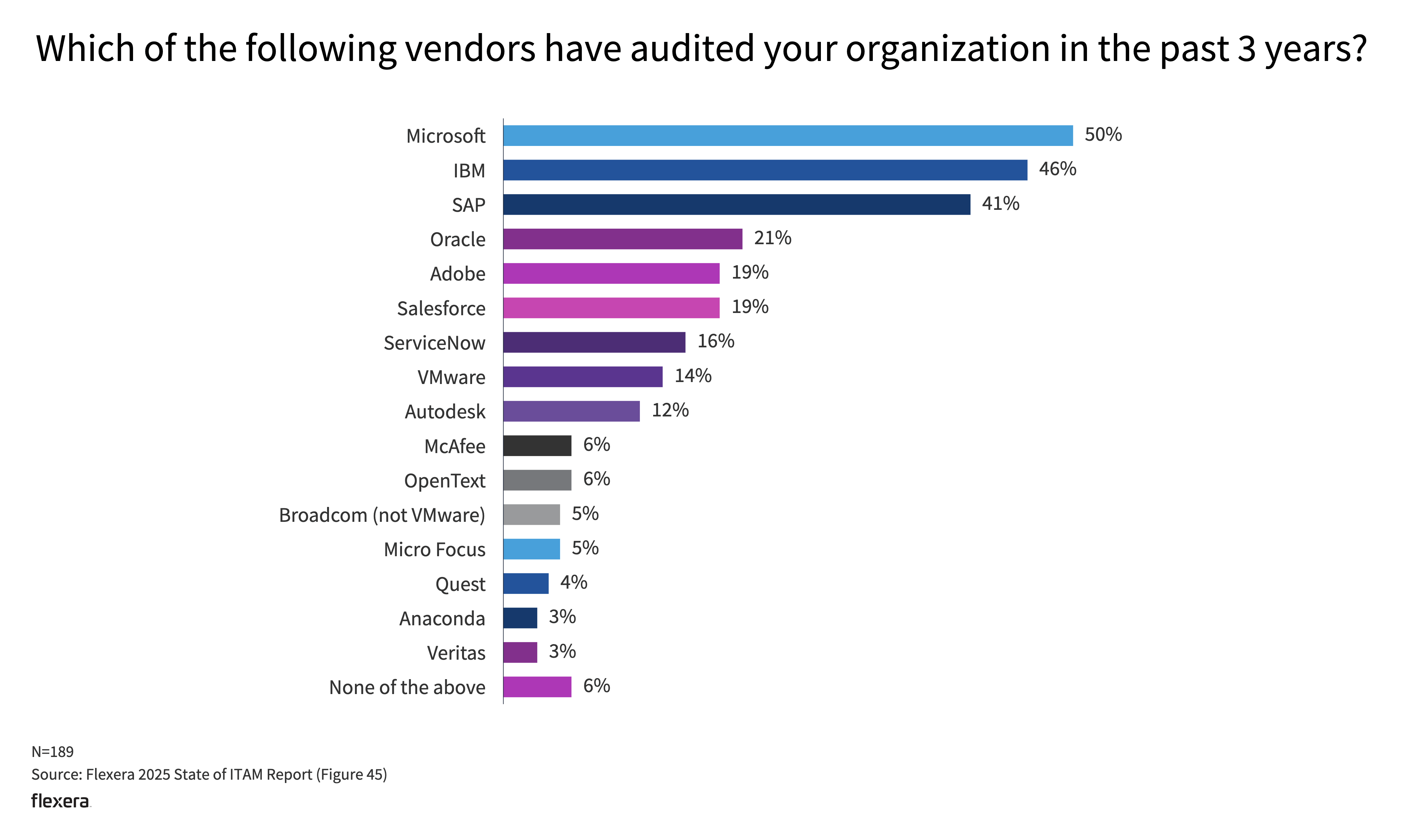 Microsoft still audits half of respondents, followed by IBM (37%). SAP (32%), ServiceNow (21%) and OpenText (6%) moved up slightly, and Anaconda (3%) is a new vendor this year.