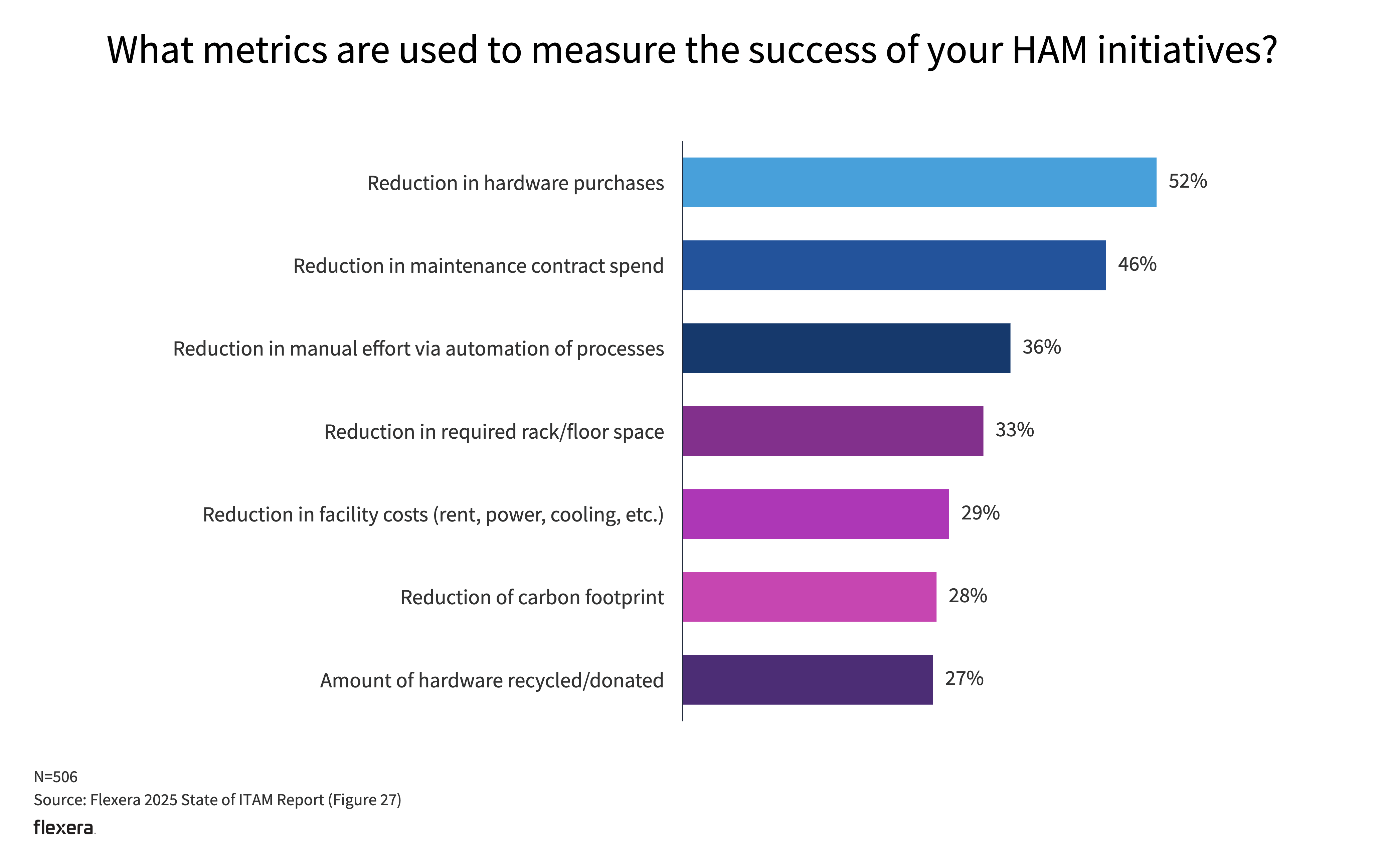 When measuring the success of HAM initiatives, the top two metrics remain the same as last year: reduction in hardware purchases (52%) and maintenance contract spend (46%). Thirty-six percent of survey respondents indicate they monitor a reduction in manual effort via automation of processes to measure the success of their HAM initiatives, and a third (33%) measure success through reduction in required rack/floor space.