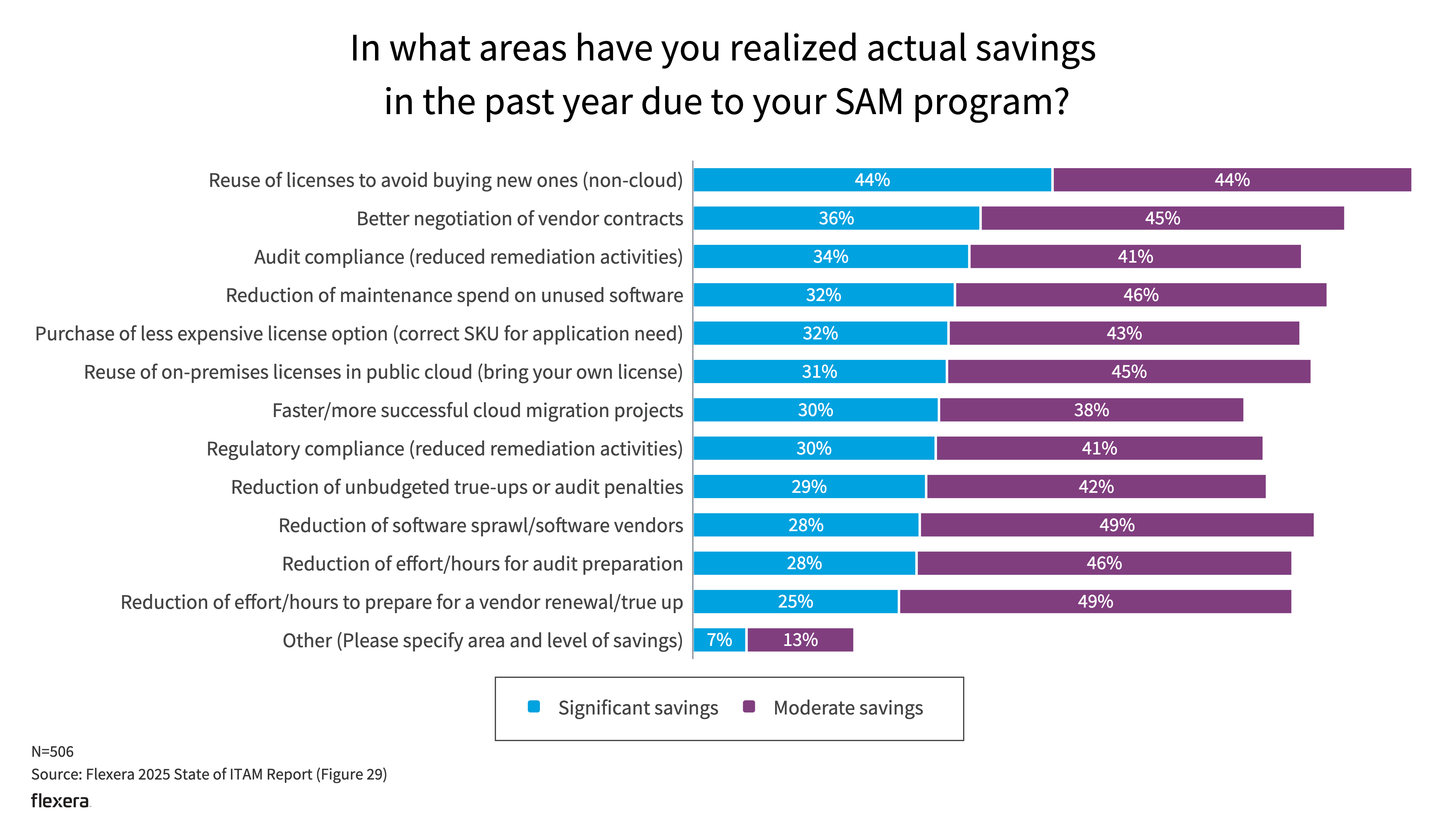 The biggest overall savings for respondents this year still comes from reuse of licenses (91%), reduction of maintenance spend on unused software (83%) and negotiation (82%)