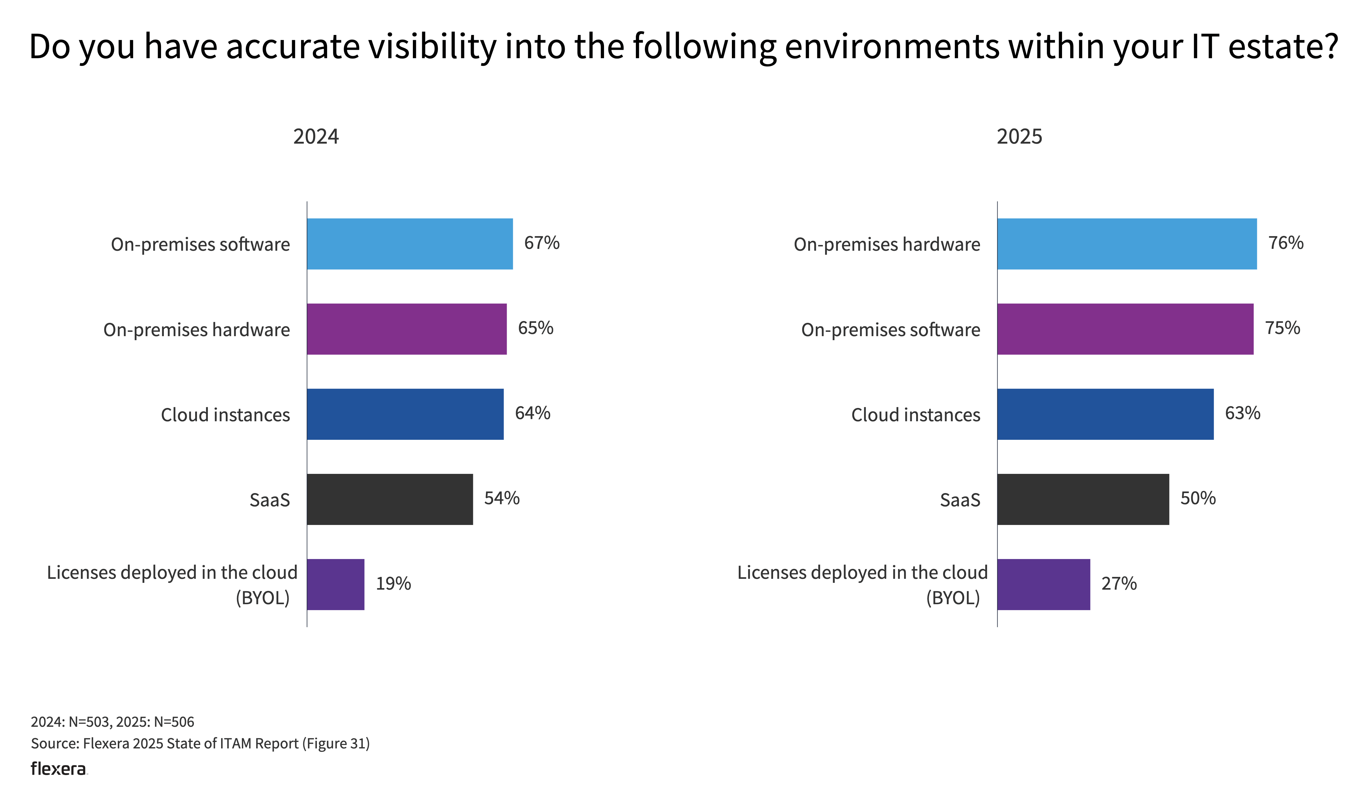 Visibility into on-premises hardware and software grew from around two-thirds of organizations last year to 76% and 75% this year, respectively. Furthermore, 63% of respondents say they have visibility into cloud instances. That being said, only half feel comfortable with SaaS, and visibility into BYOL positions is still extremely low at only 27%.