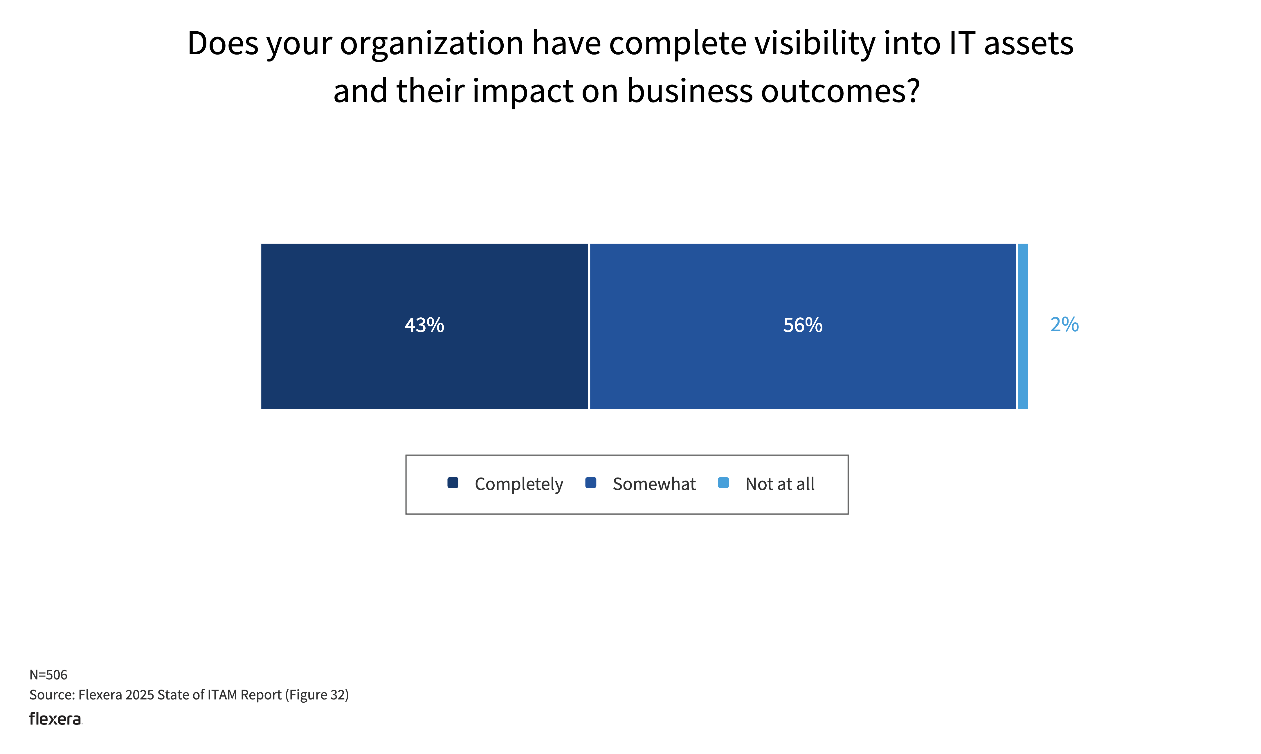 Although ITAM is gaining visibility in some specific environments, complete visibility into IT assets has decreased to 43% from 47% year over year, indicating there’s still room for improvement when it comes to the ability to look at IT environments holistically.