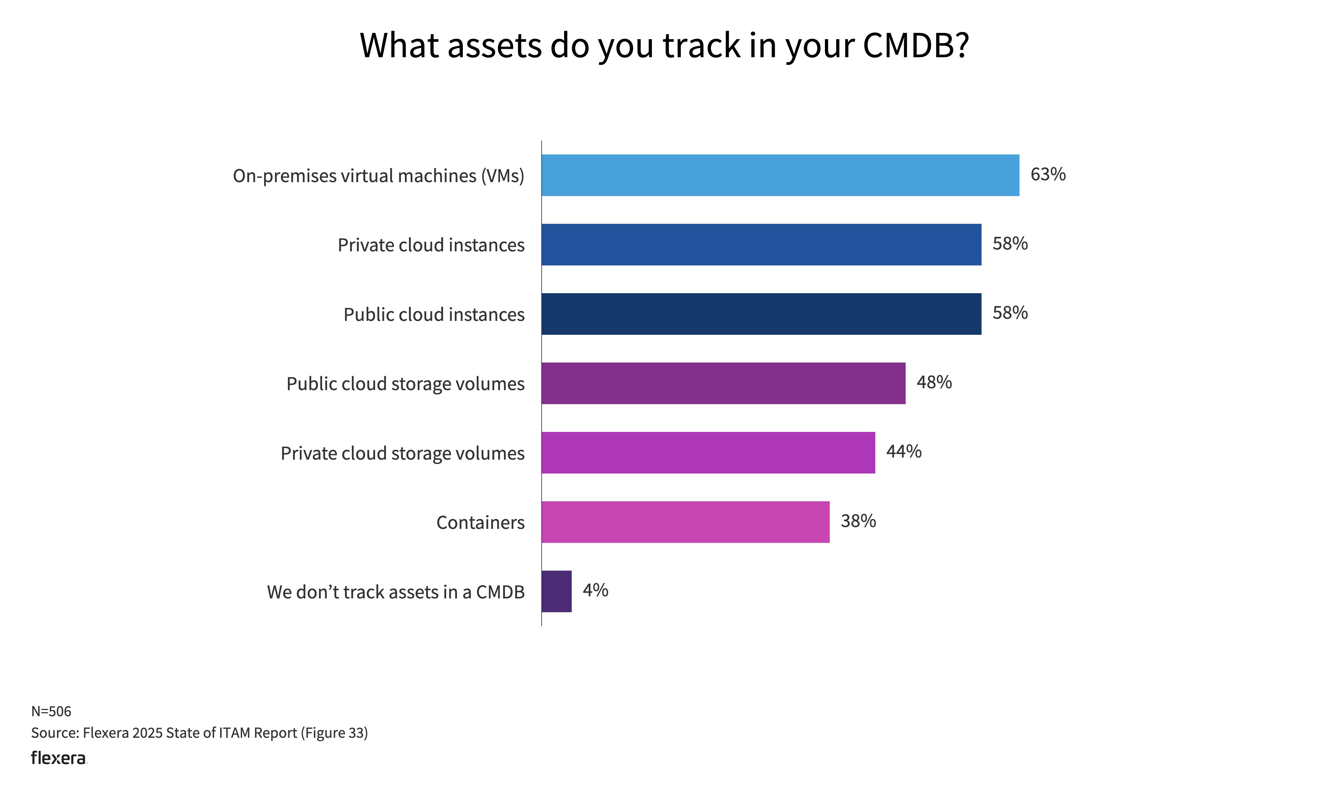 Organizations continue to use CMDBs to track broader assets. Private cloud instances had a significant drop (from 66% last year to 58% this year), and containers increased significantly (from 27% to 38% year over year). Managing software on containers will become a bigger priority moving forward a very strong priority.