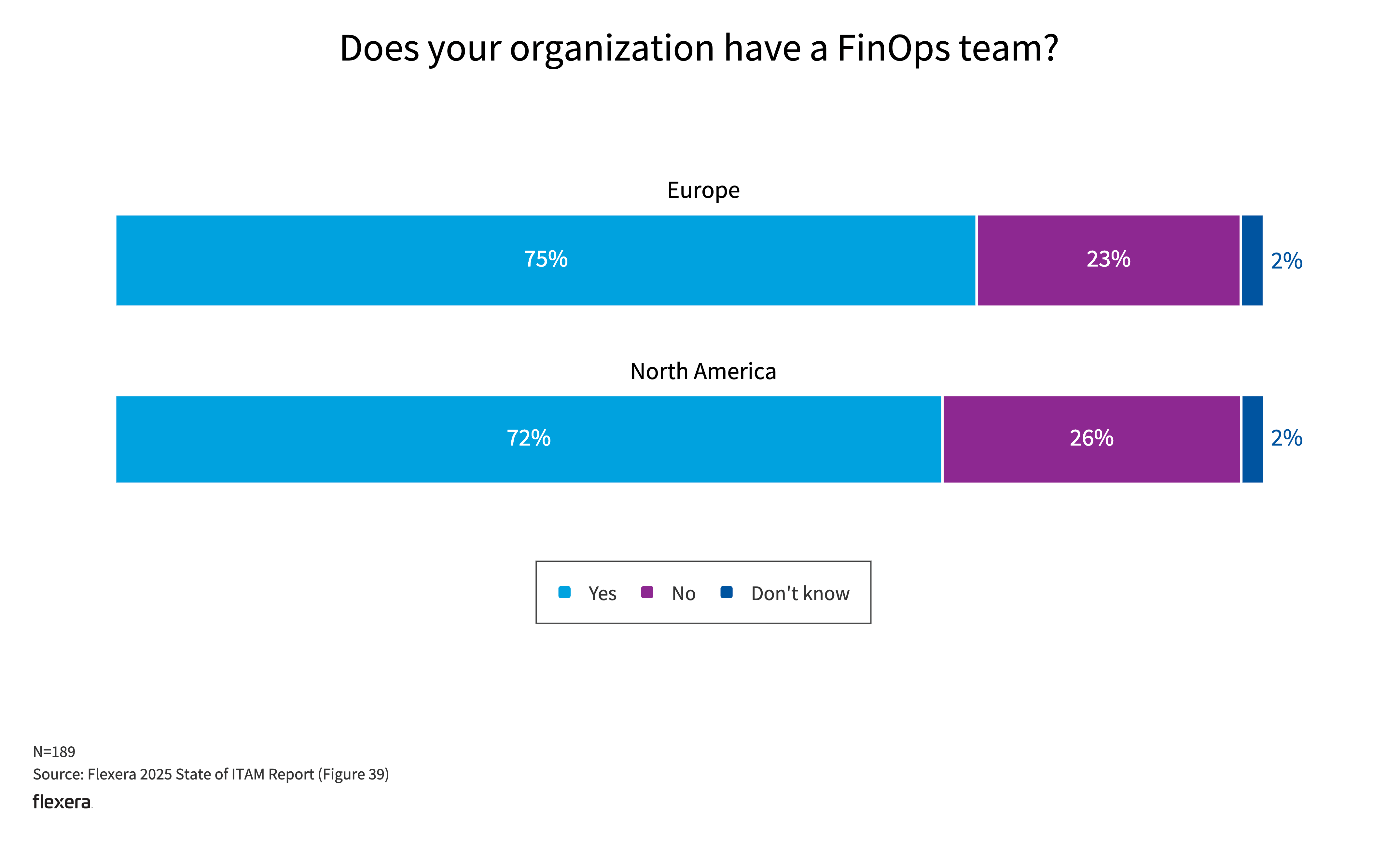 Results from this year’s survey show there’s a 5 percentage point difference from last year in organizations that have a dedicated FinOps team (down from 77% to 72% year over year). We suspect this could be due to growing convergence and collaboration between ITAM and FinOps teams, but we’ll continue to keep an eye on this trend as these specialties evolve.