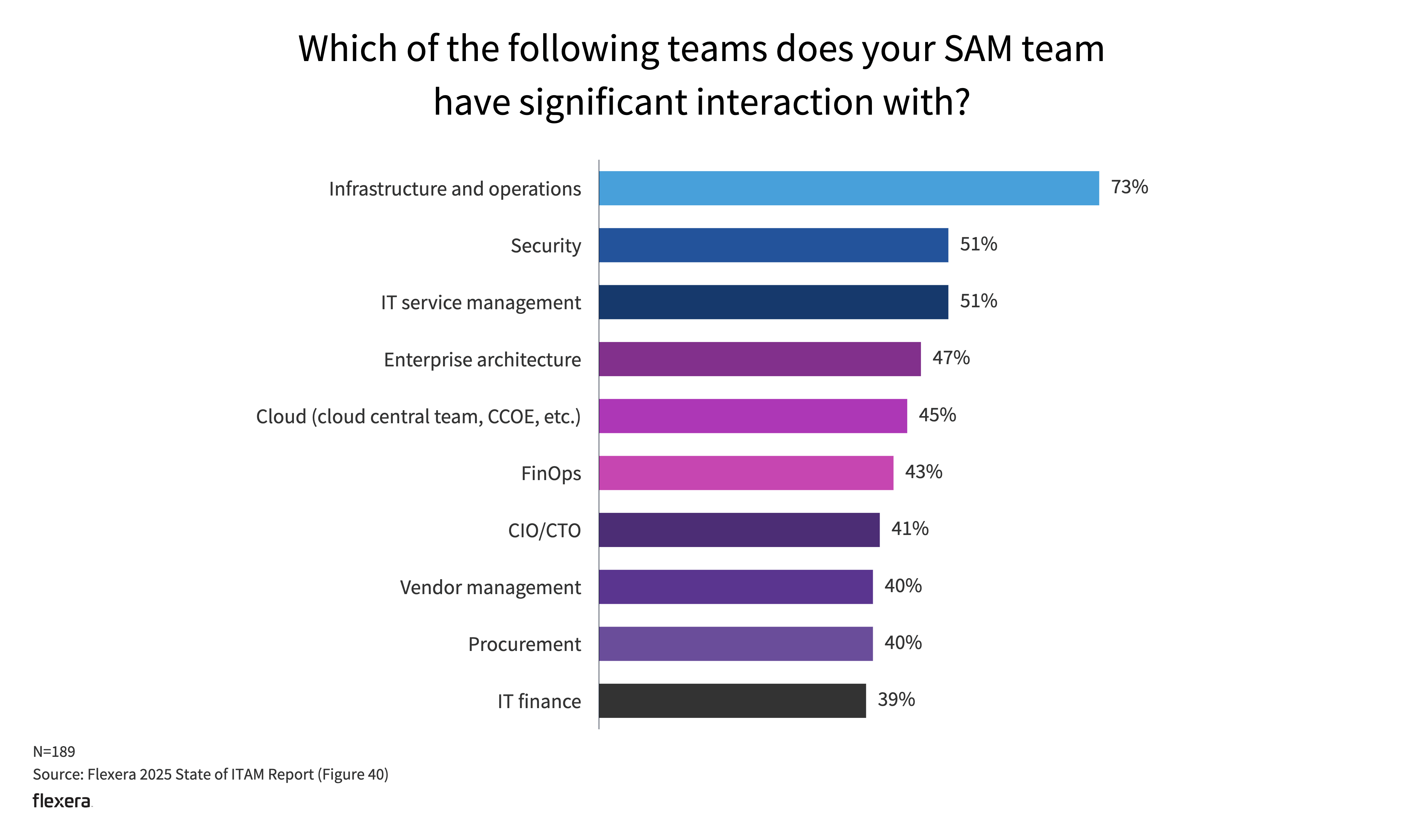That being said, when asked which teams SAM teams have significant interaction with, results from this year’s survey show that interaction with FinOps has increased from 32% to 38% year over year. Unsurprisingly, ITAM teams have the highest interaction with the traditional infrastructure and operations (68%), ITSM (55%) and security teams (49%). As more software moves into the cloud, we’re seeing increases in ITAM collaboration with FinOps (38%) and cloud teams (44%).