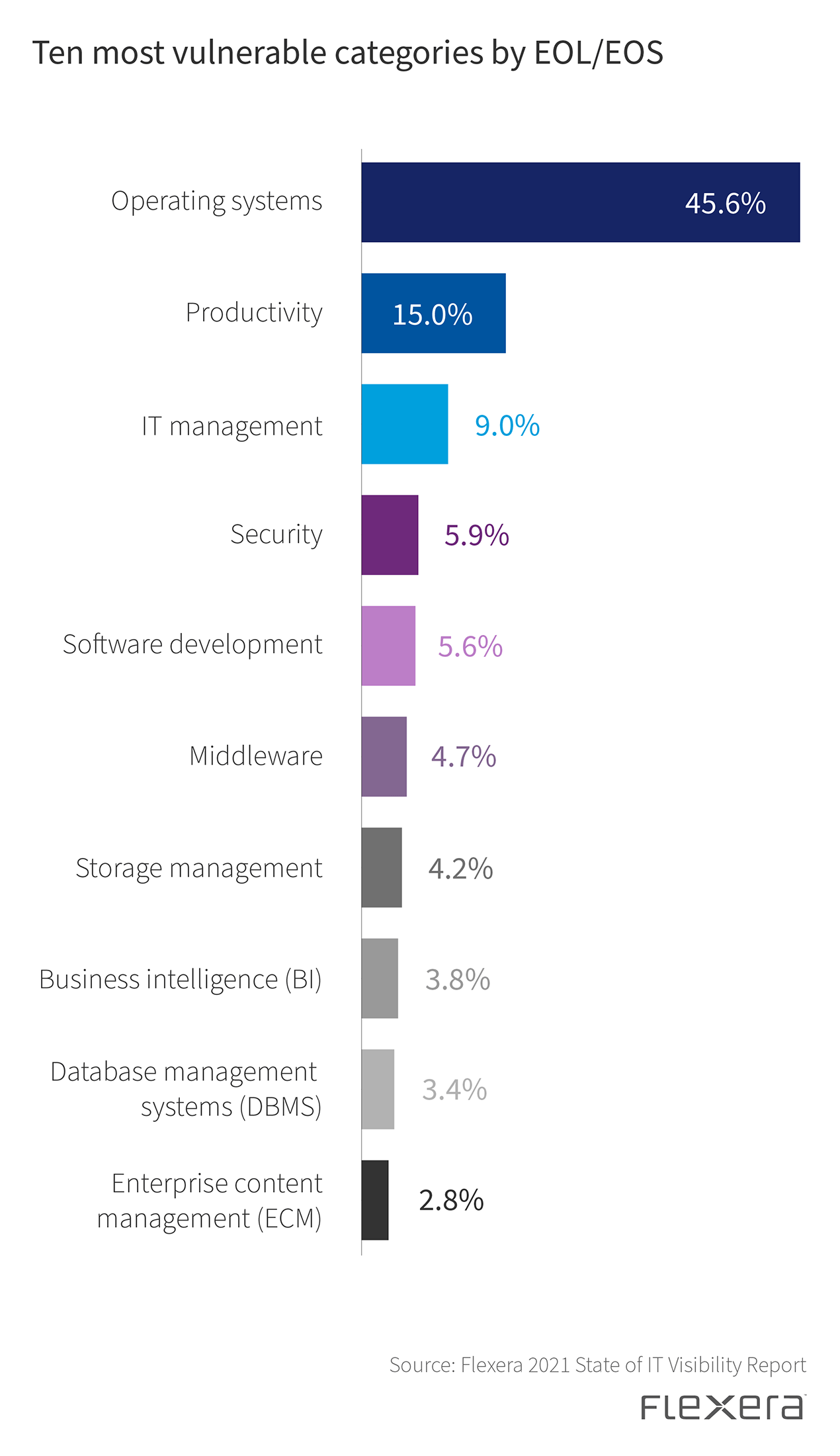 Visibility into IT data—especially toward adaptability to changing technology—is foundational to your success. This report explores the thinking of more than 300 global technology decision-makers and users about IT infrastructure, asset management, vulnerability posture and industry trends. It shares their current and future IT management strategies alongside tactical data regarding software obsolescence and vulnerability mitigation for strategic planning. Nearly half of the survey respondents cited vulnerabilities as their greatest concern for their IT assets, followed by software sprawl and lifecycle management.